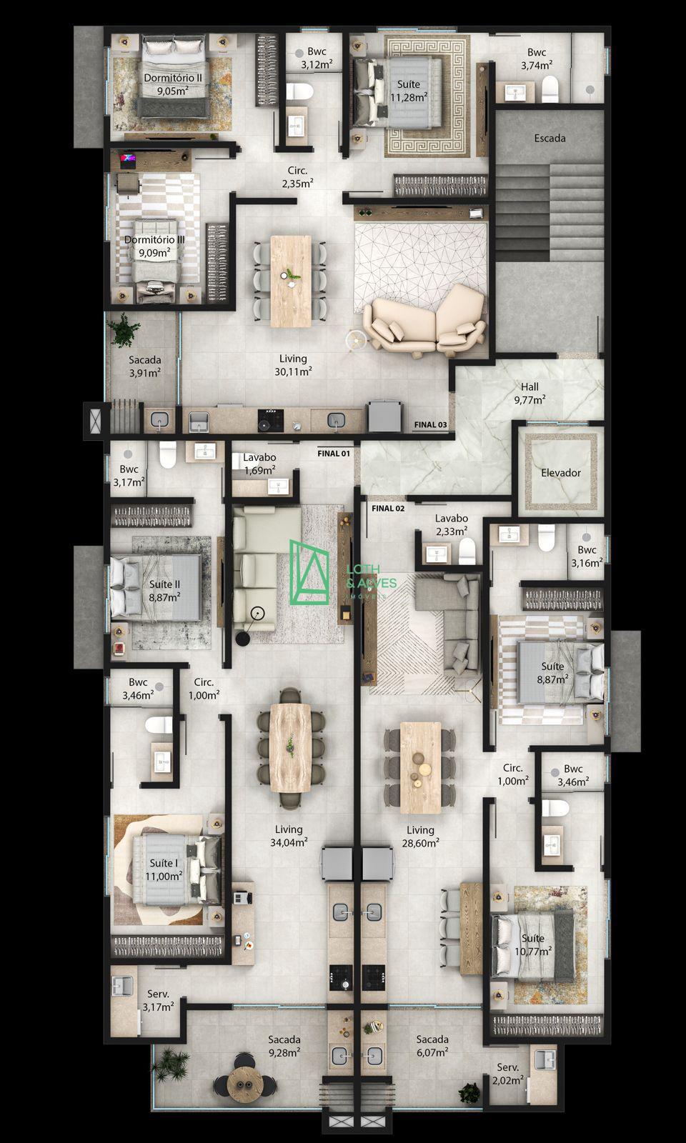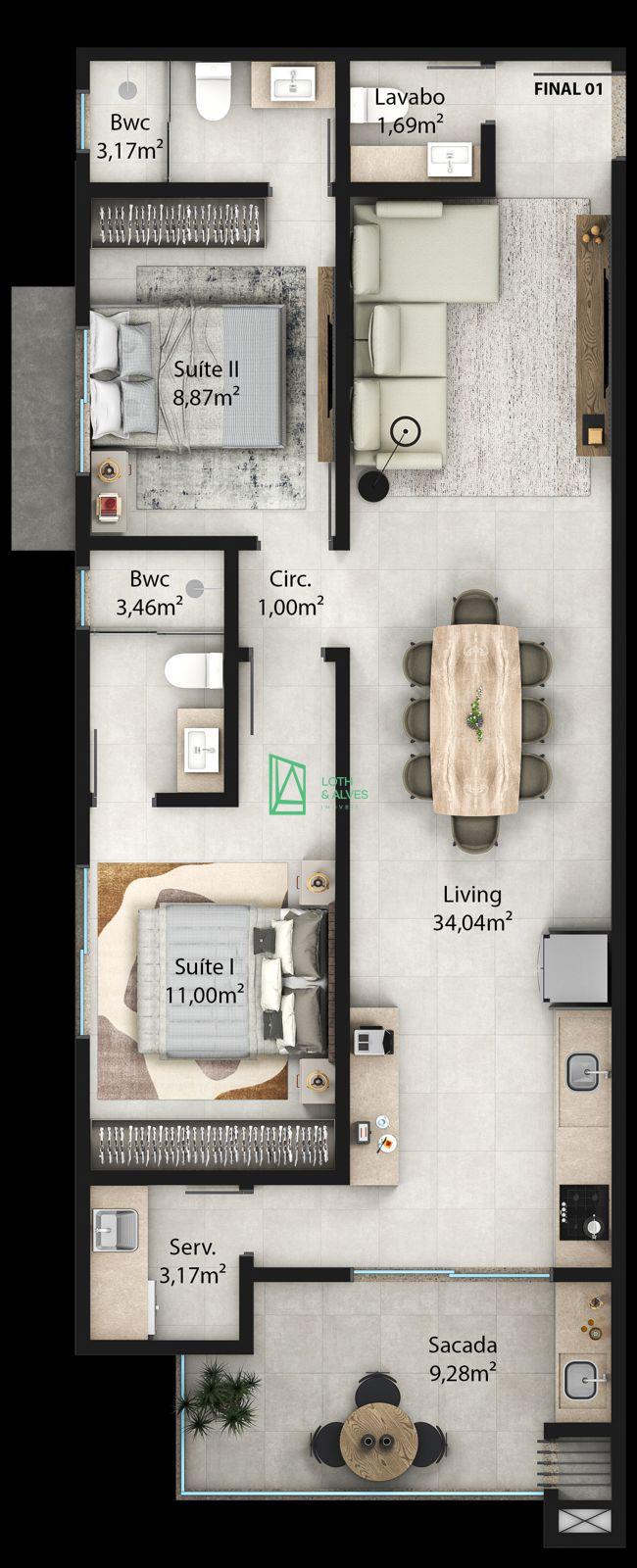 Possui 02 suites, sacada com churrasqueira, cozinha, living integrado, area de serviço, lavabo, e 01 vaga de garagem