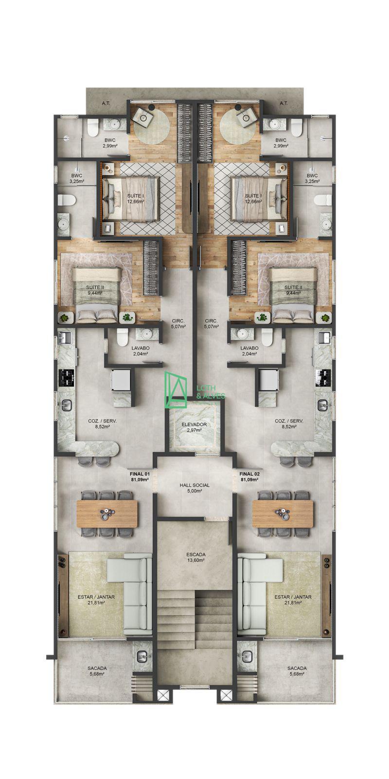 Apartamento possui 02 suites, lavabo, sacada com churrasqueira, cozinha, living integrado, 01 vaga de garagem