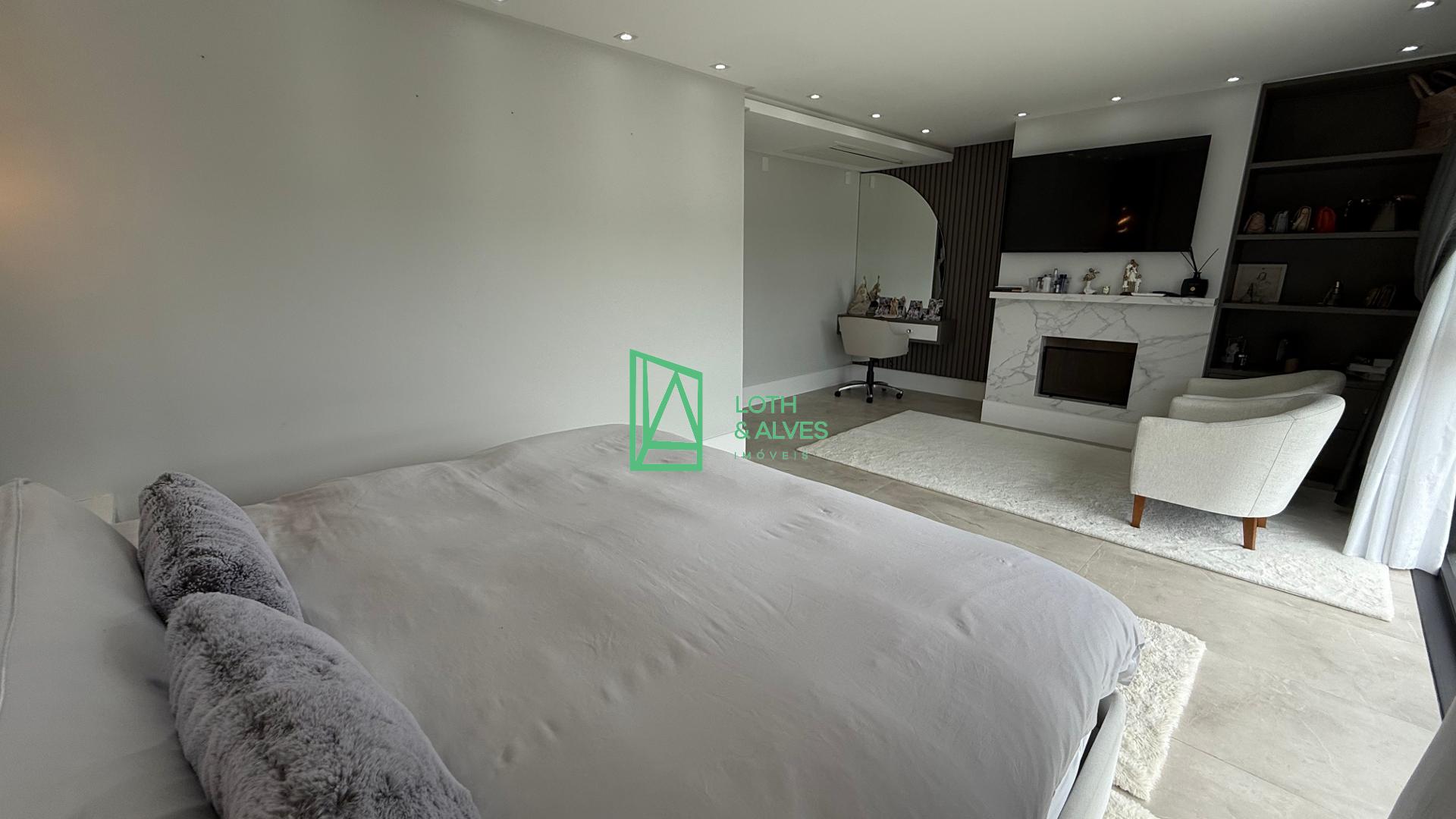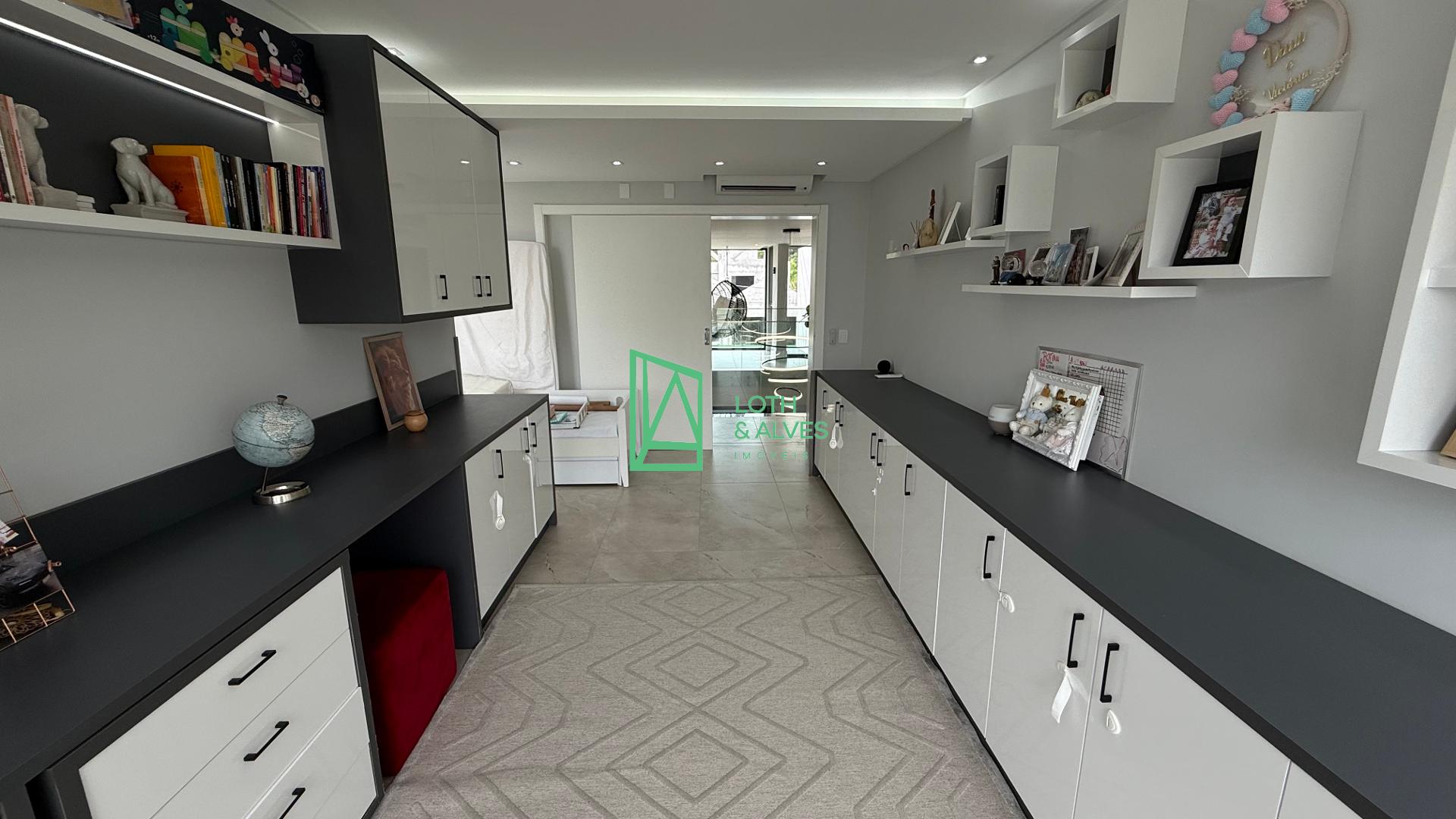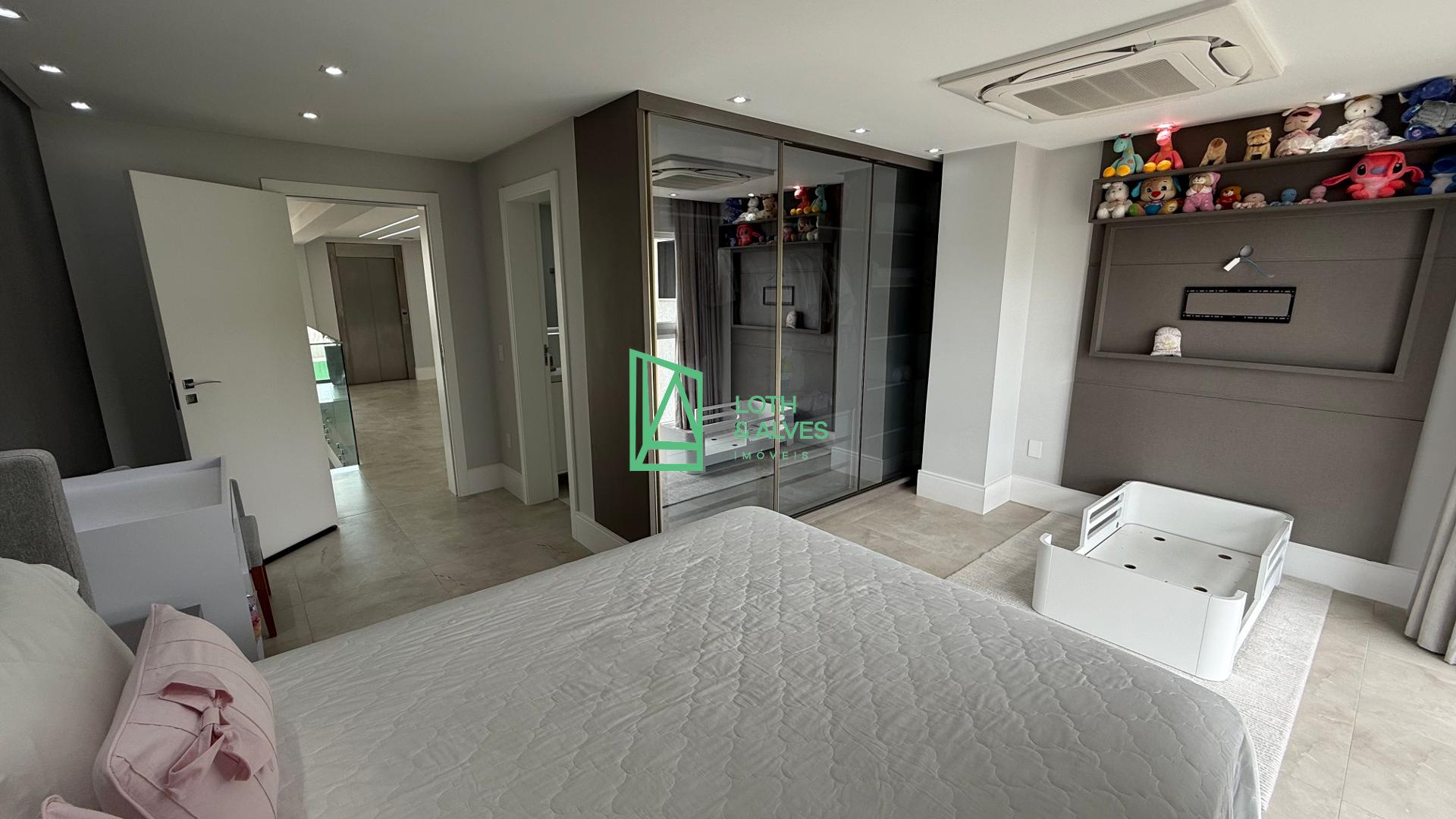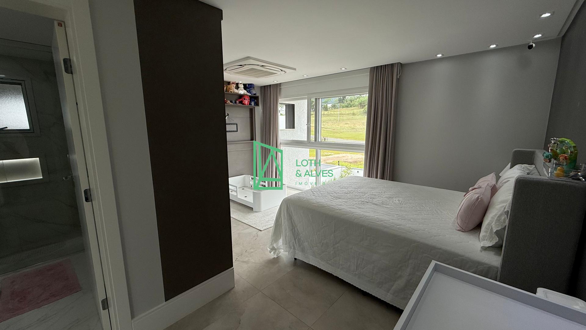 No segundo pavimento encontram-se os ambientes mais íntimos da residência. A suíte master conta com closet, enquanto outra suíte dispõe de varanda integrada, ideal também para uso como brinquedoteca. Há ainda mais uma suíte e um escritório, que pode ser facilmente adaptado como dormitório adicional conforme a necessidade da família.