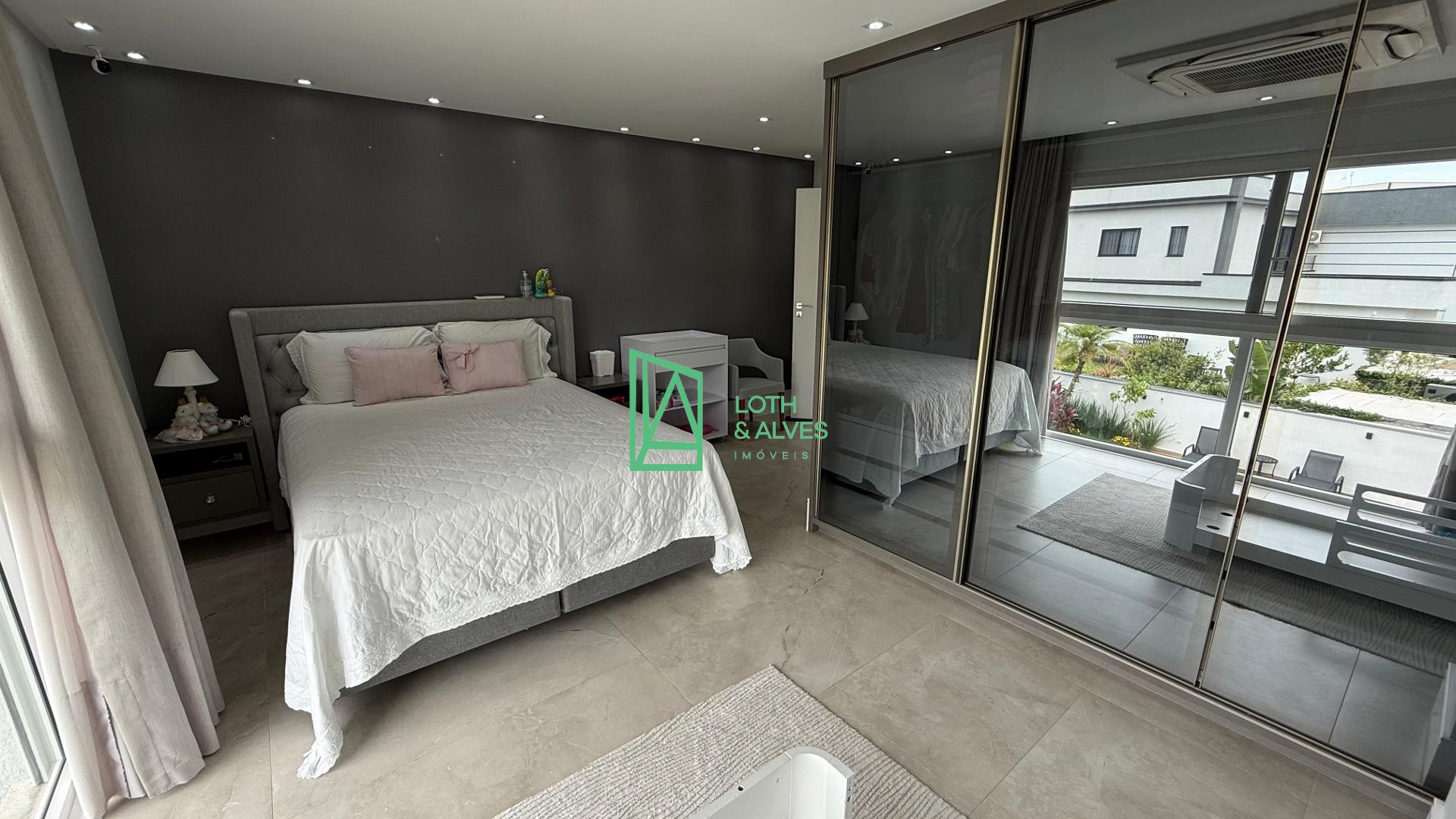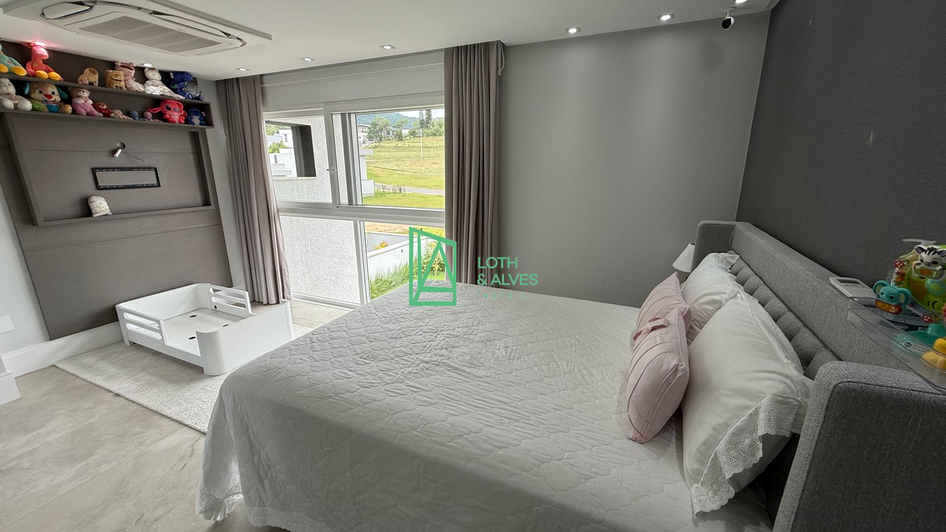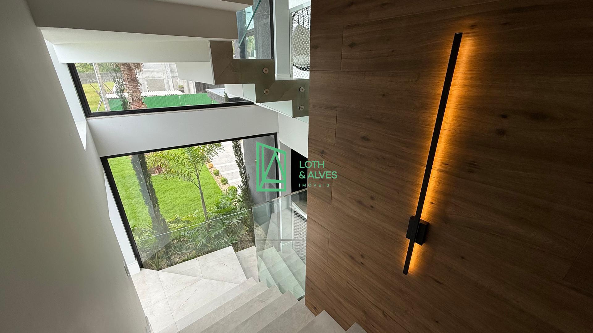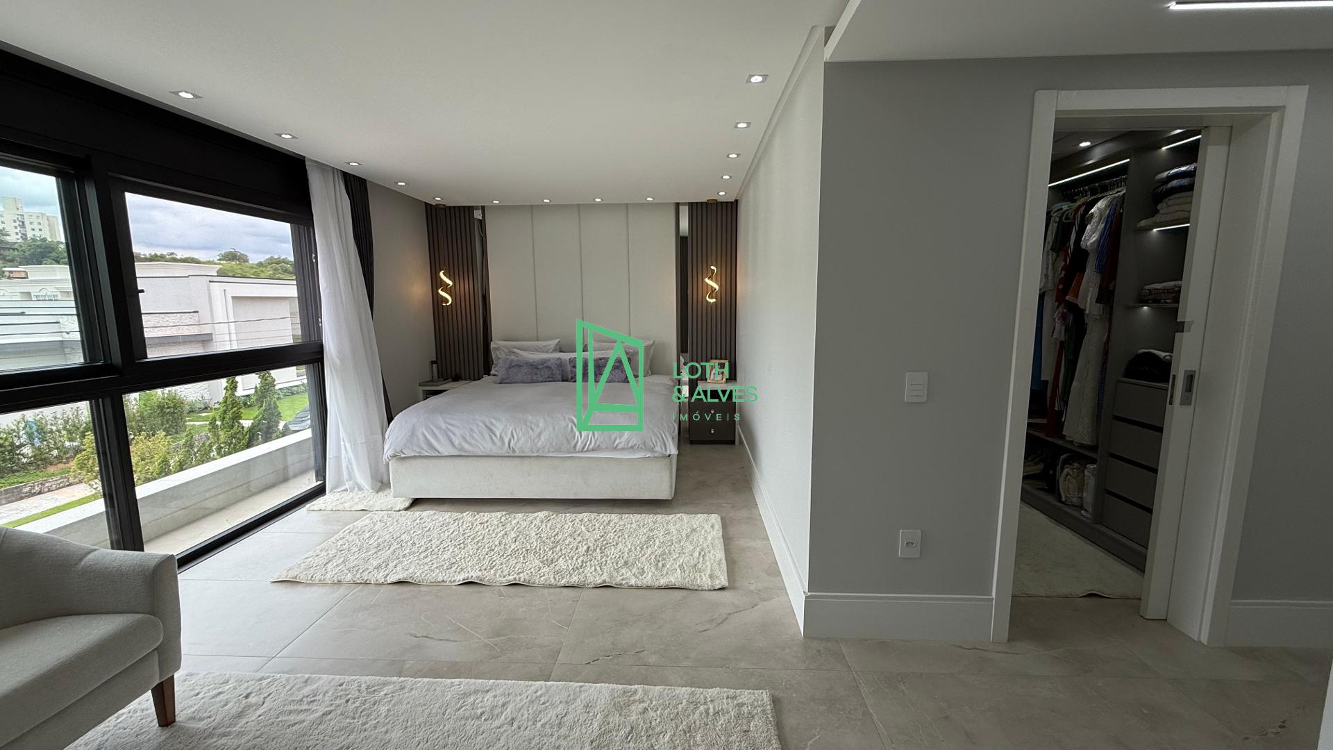 No segundo pavimento encontram-se os ambientes mais íntimos da residência. A suíte master conta com closet, enquanto outra suíte dispõe de varanda integrada, ideal também para uso como brinquedoteca. Há ainda mais uma suíte e um escritório, que pode ser facilmente adaptado como dormitório adicional conforme a necessidade da família.