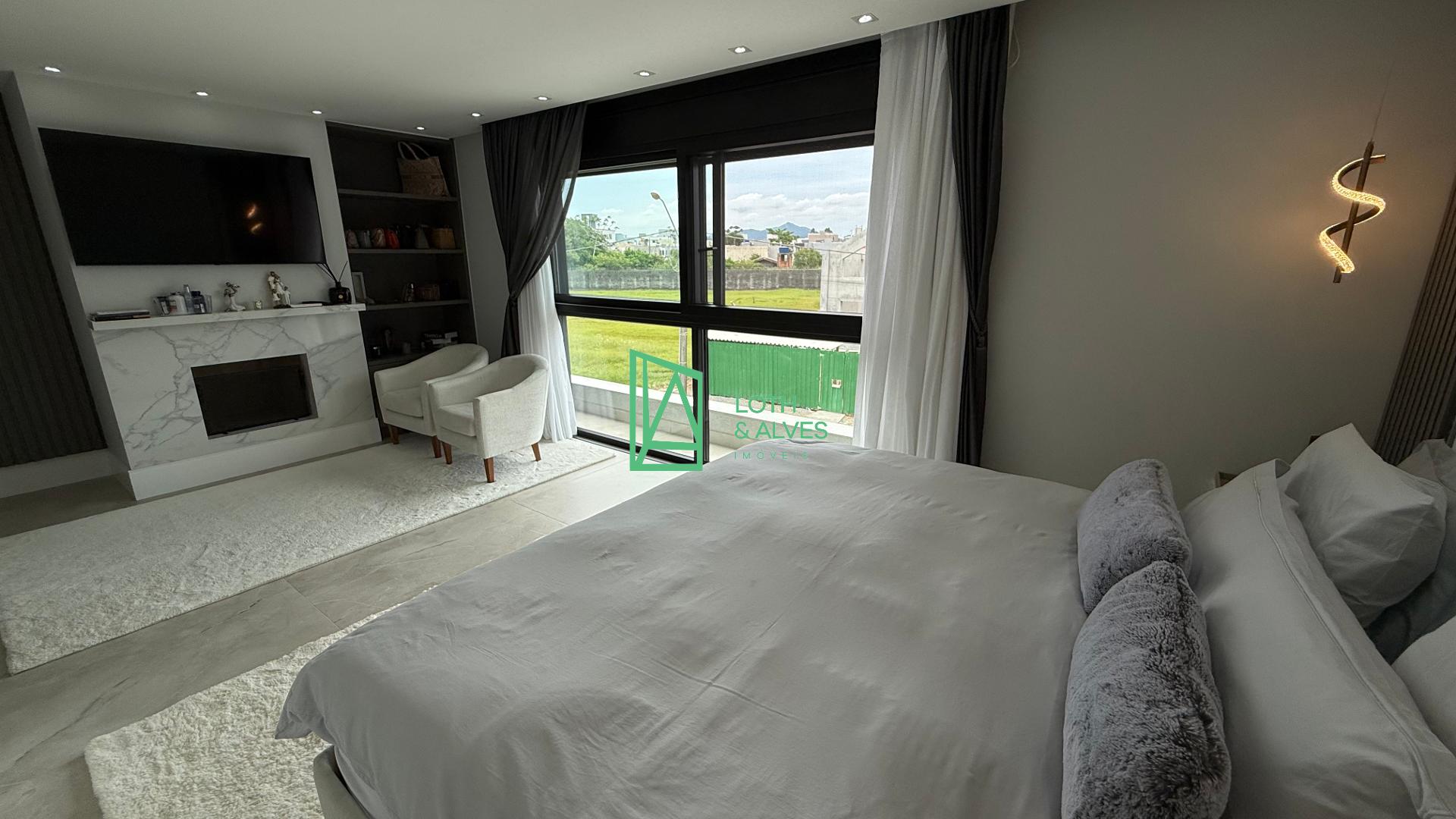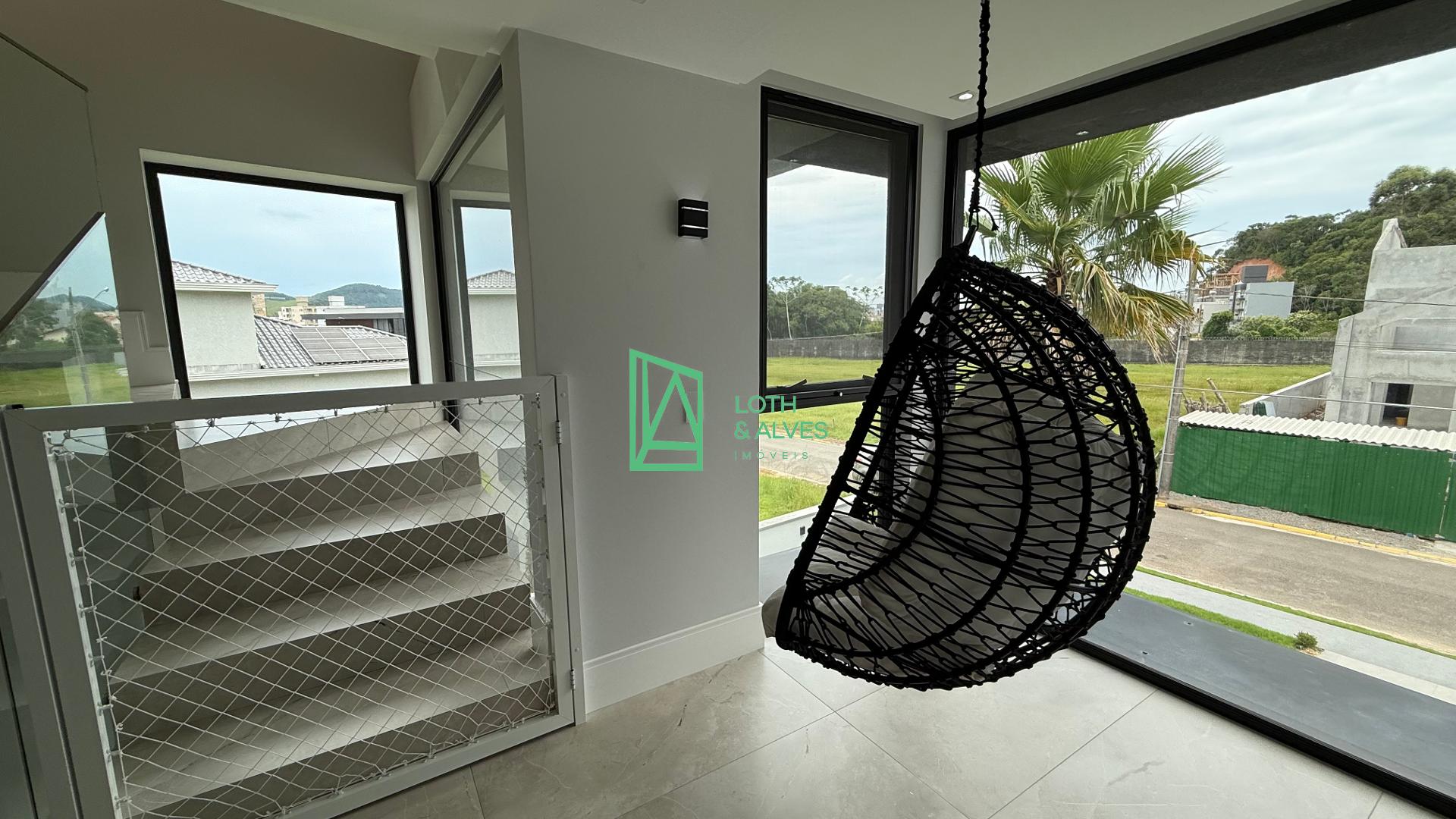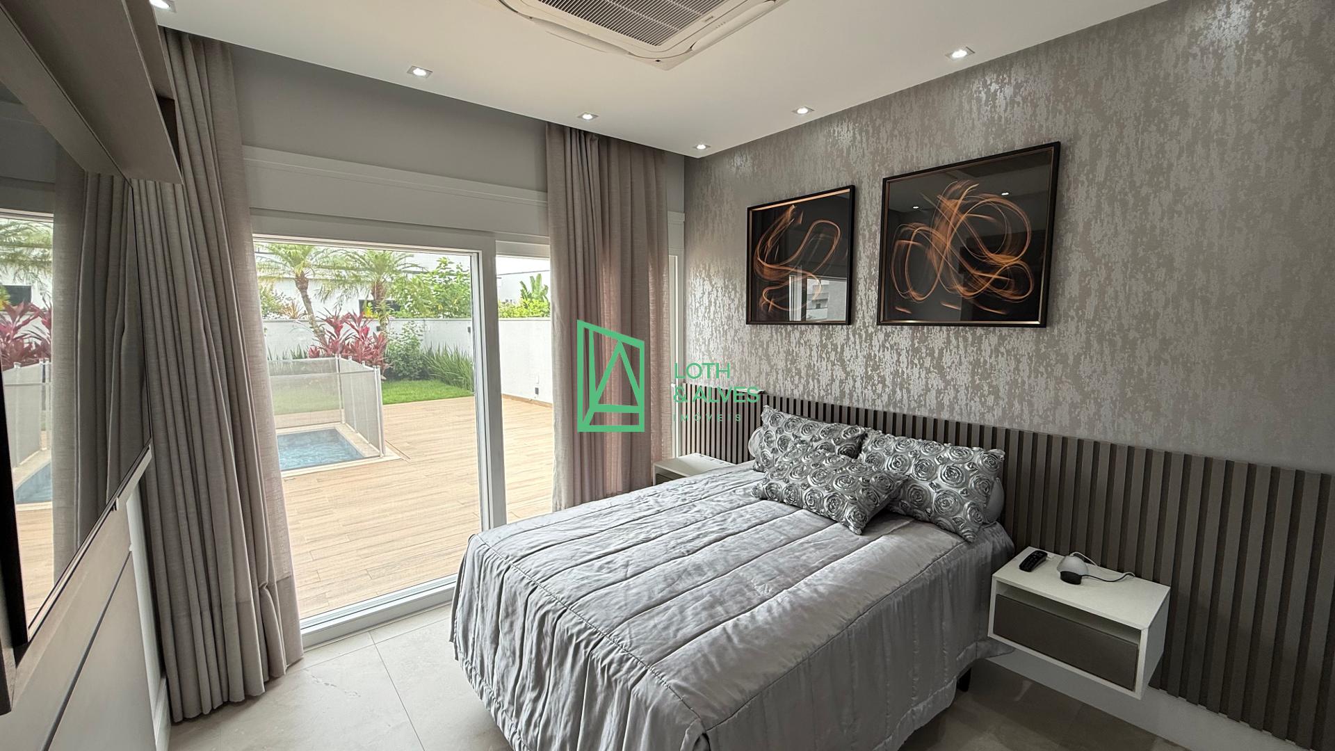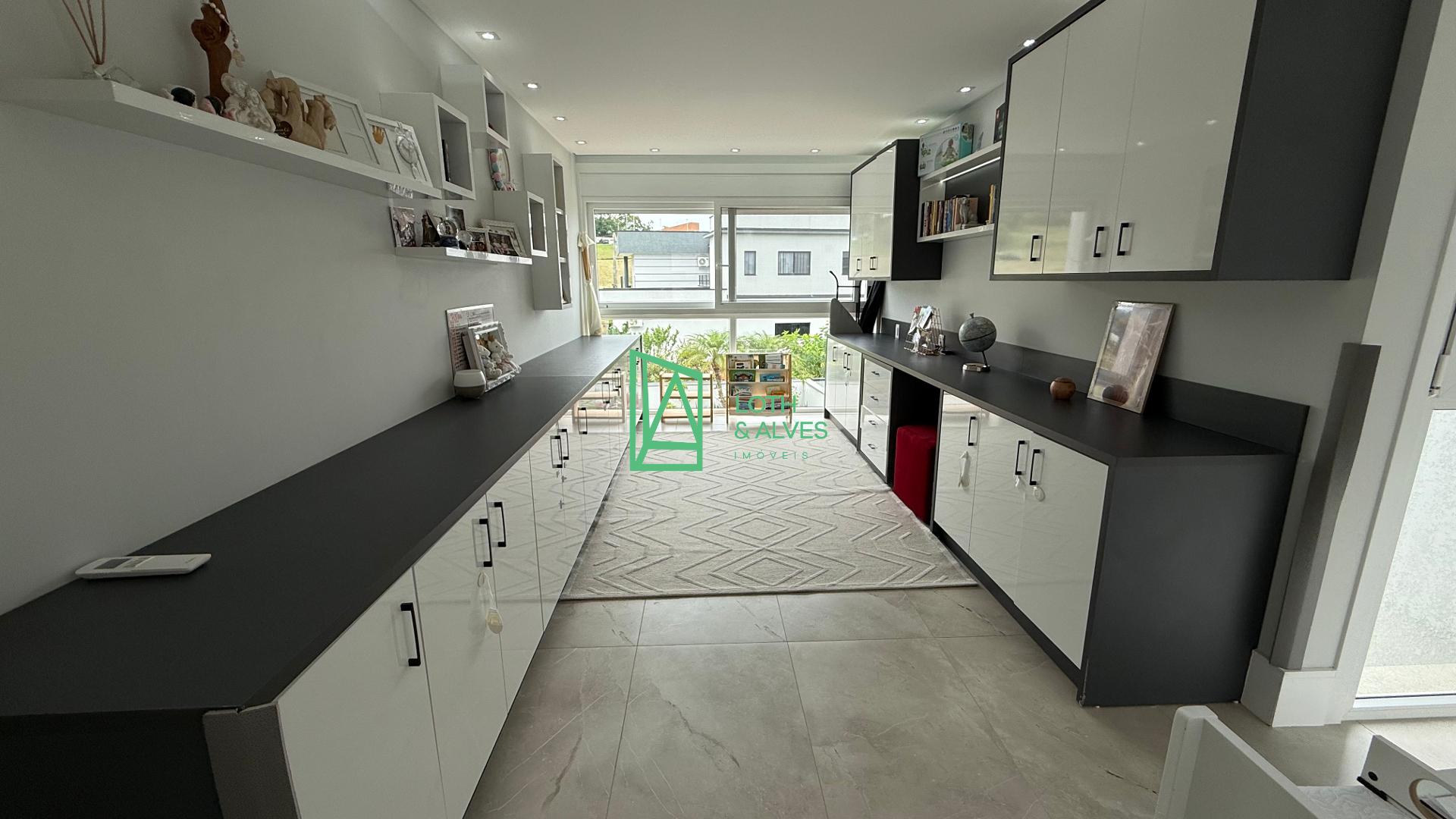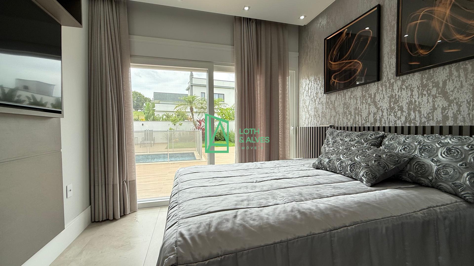 No segundo pavimento encontram-se os ambientes mais íntimos da residência. A suíte master conta com closet, enquanto outra suíte dispõe de varanda integrada, ideal também para uso como brinquedoteca. Há ainda mais uma suíte e um escritório, que pode ser facilmente adaptado como dormitório adicional conforme a necessidade da família.