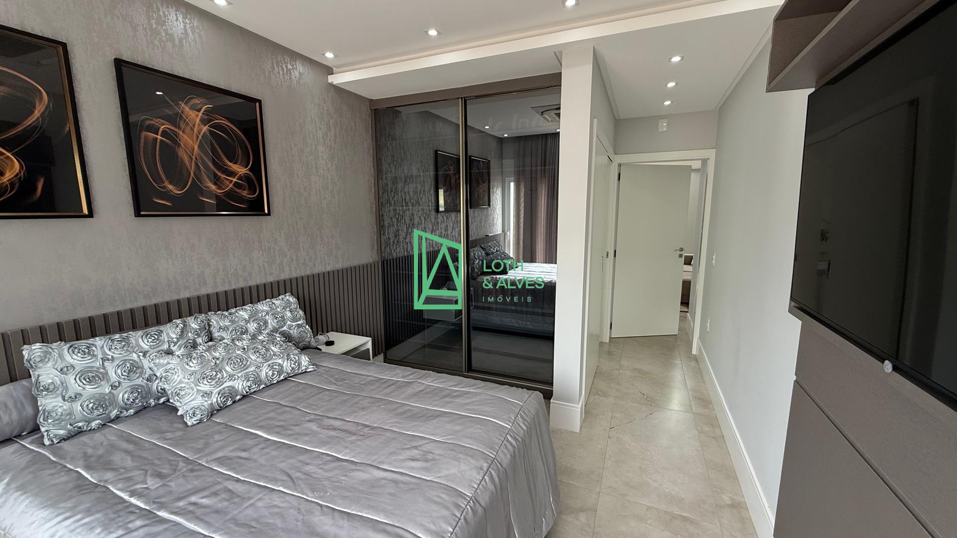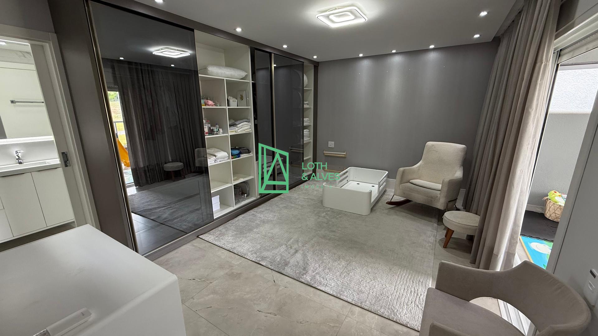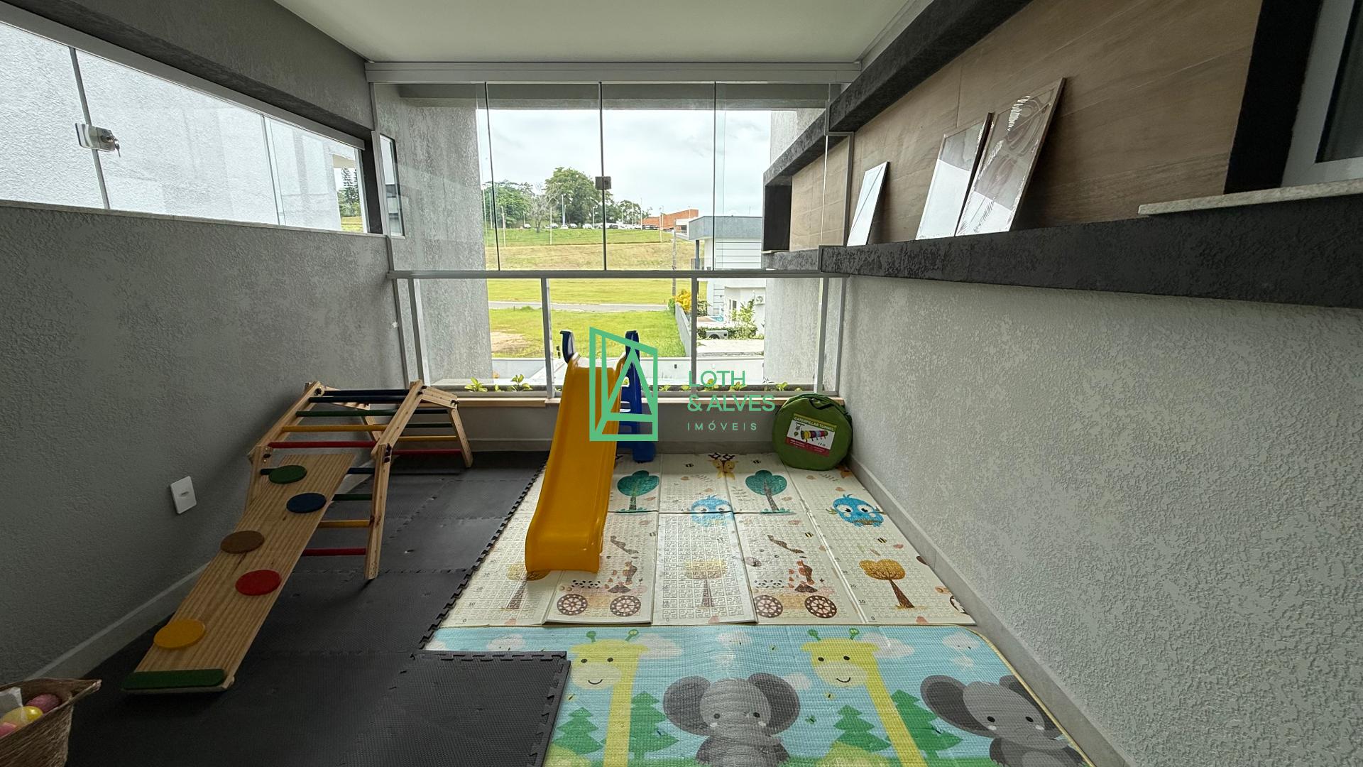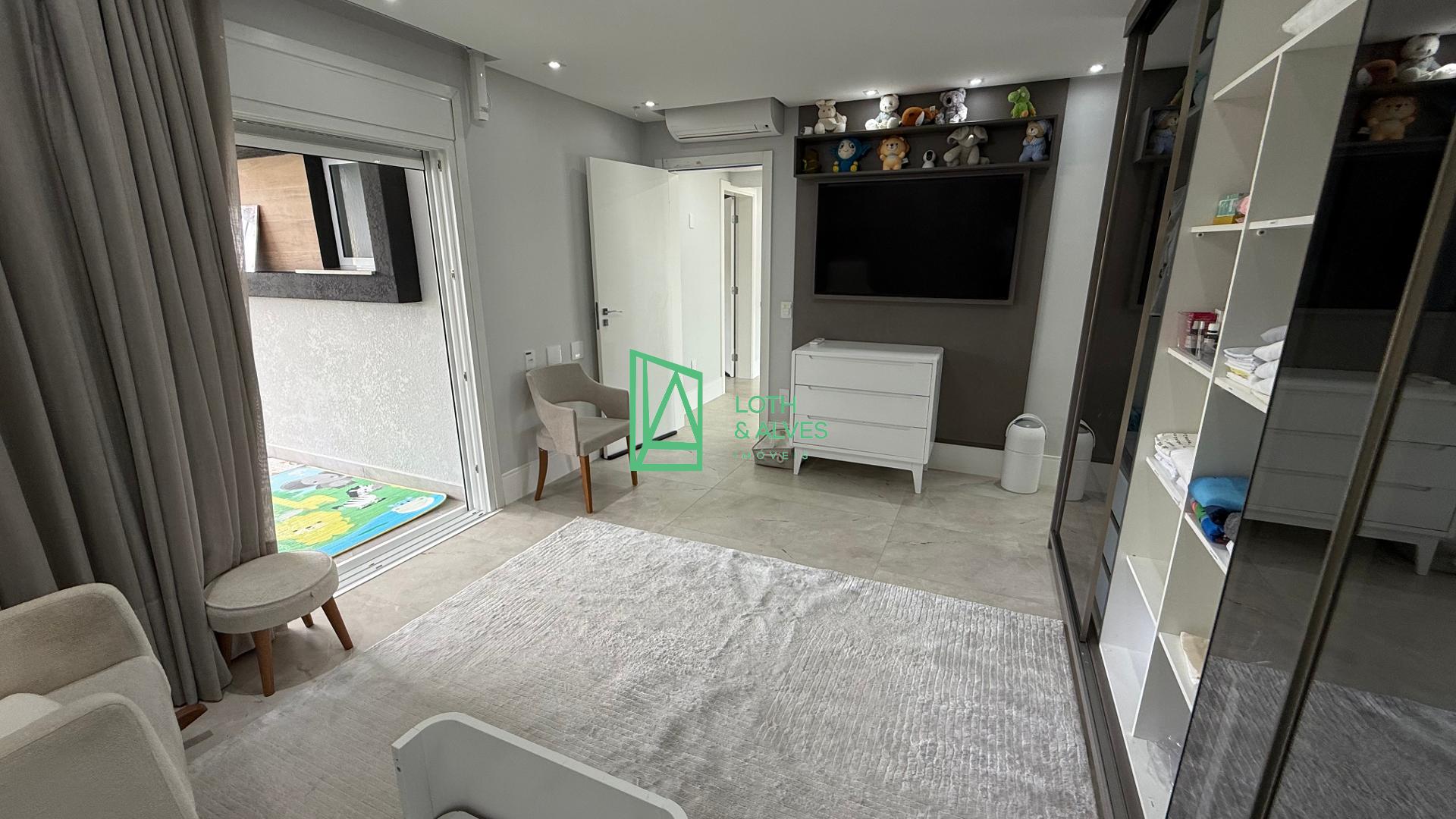No segundo pavimento encontram-se os ambientes mais íntimos da residência. A suíte master conta com closet, enquanto outra suíte dispõe de varanda integrada, ideal também para uso como brinquedoteca. Há ainda mais uma suíte e um escritório, que pode ser facilmente adaptado como dormitório adicional conforme a necessidade da família.