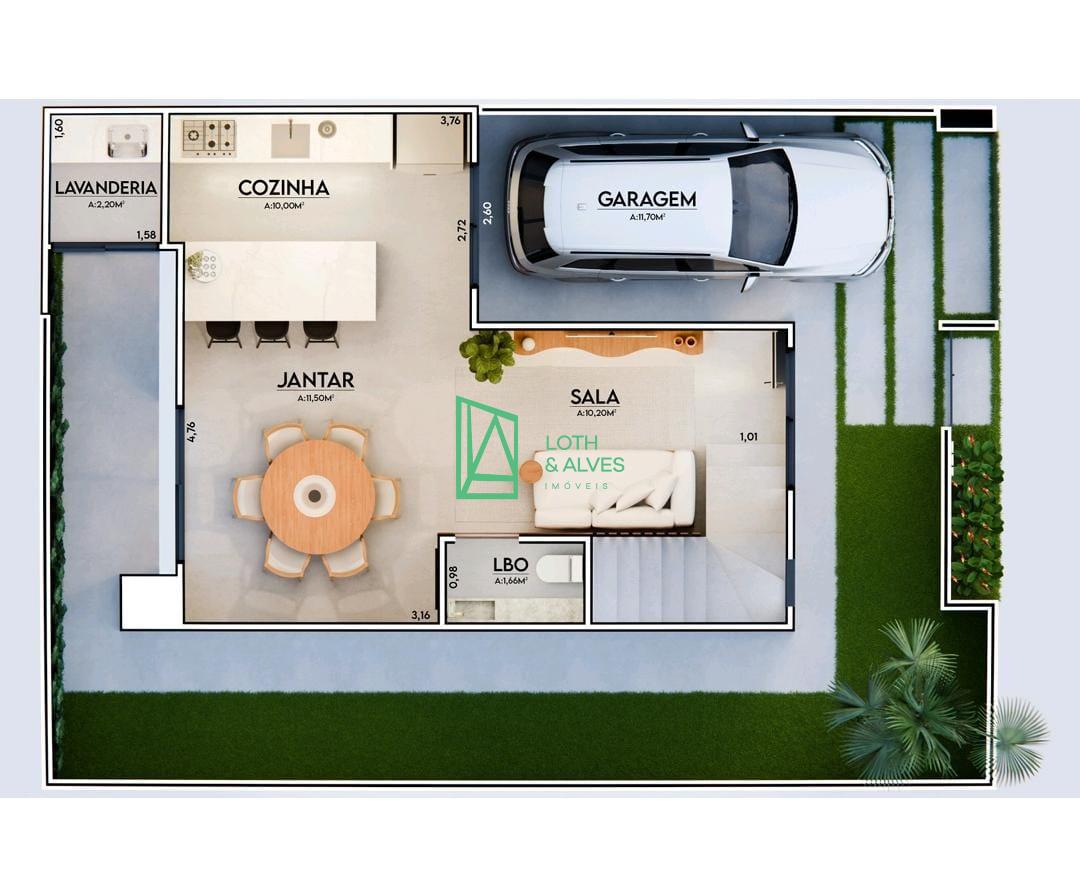 Andar térreo com cozinha, living integrado, lavabo, area de serviço e 01 vaga de garagem coberta