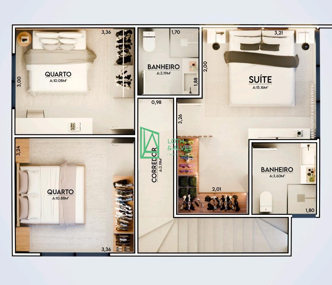 parte superior possui 03 dormitórios, sendo 01 suite com espaço para closet e banheiro social